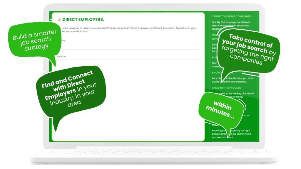 Many great opportunities are never posted on job boards, they’re filled through internal referrals, proactive outreach, or by sourcing directly from professional networks. Our platform helps jobseekers identify and approach direct employers that align with their background, values, and goals.