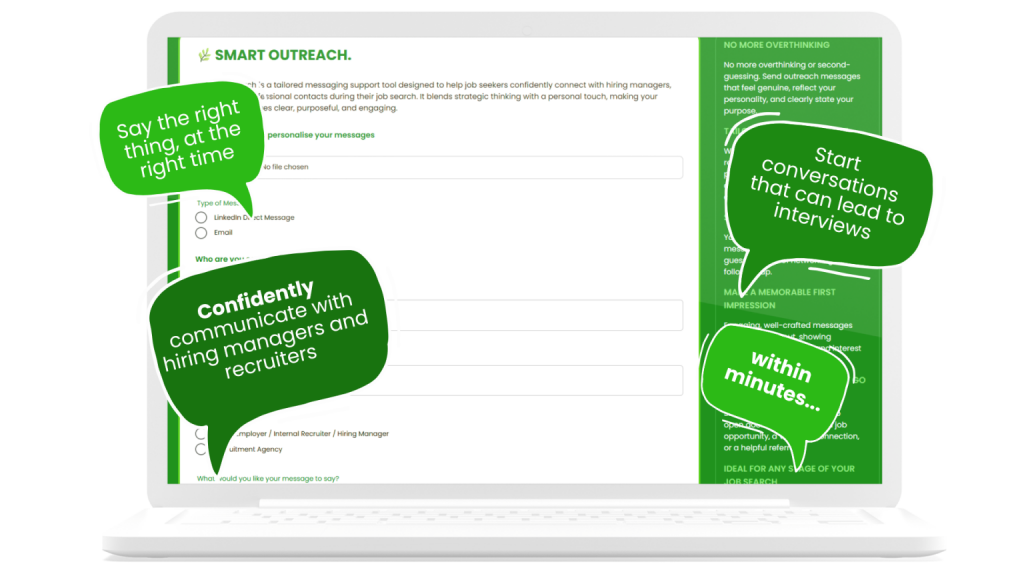 Reaching out to recruiters and employers directly can be daunting. Smart Reach gives users ready-made message templates and guidance on how to introduce themselves, follow up after an interview, or reconnect with past colleagues. All templates are customisable and aligned with UK hiring norms.